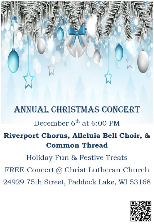 PADDOCK LAKE, Wis. — Christ Lutheran Church will host a free Christmas concert on Saturday, December 6, featuring performances by the Riverport Chorus, the Alleluia Bell Choir, and the Common Thread ensemble — a festive community tradition that draws families from across western Kenosha County each year.