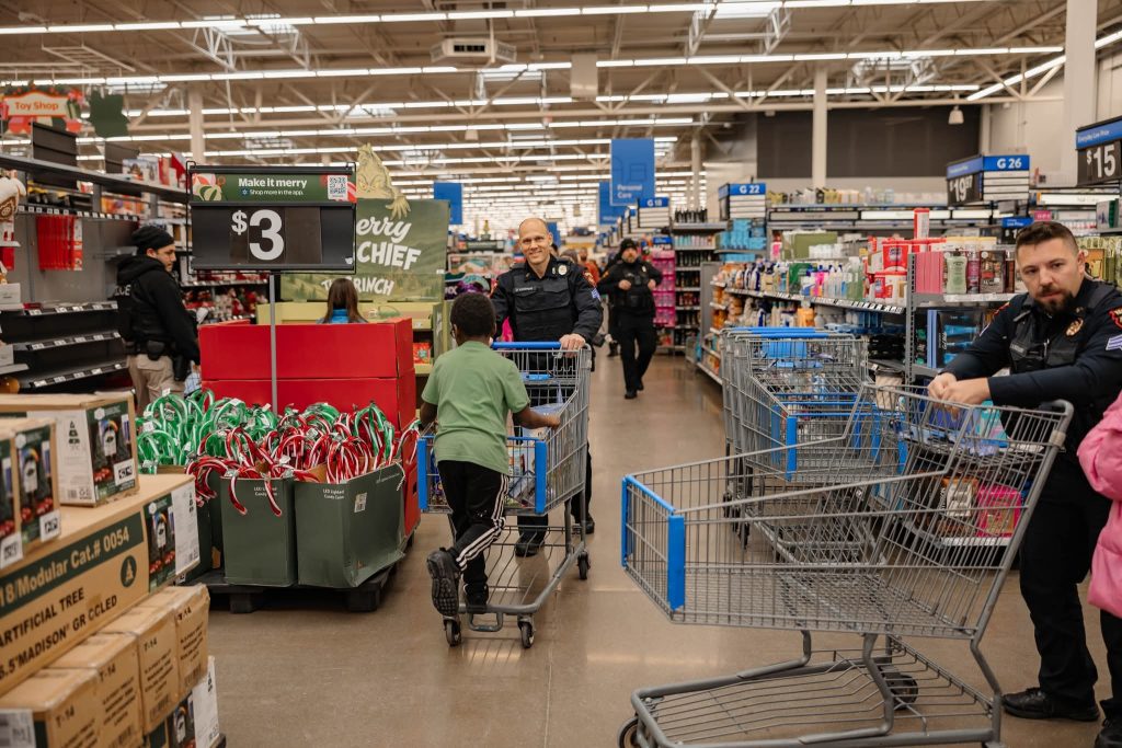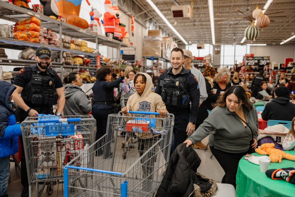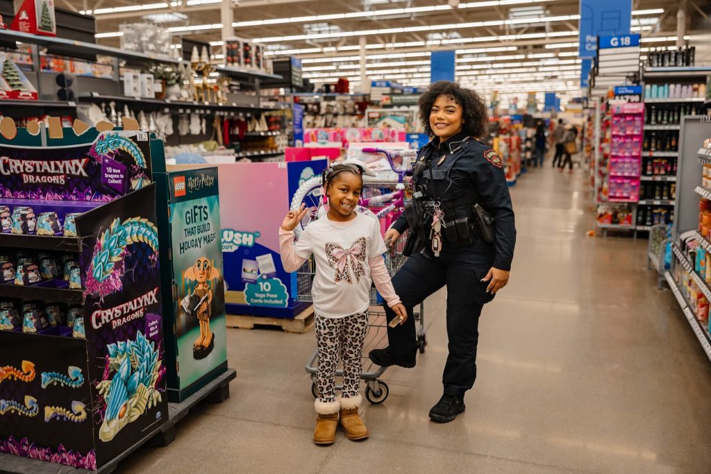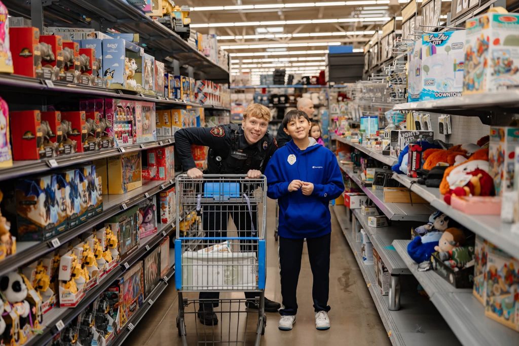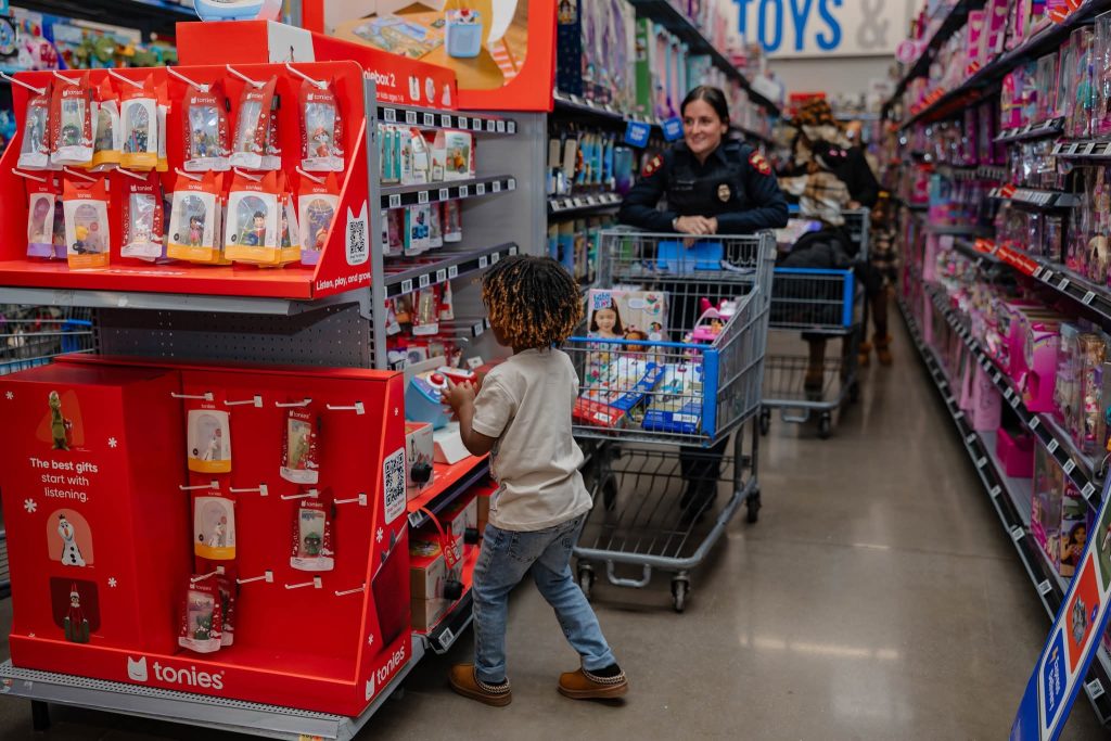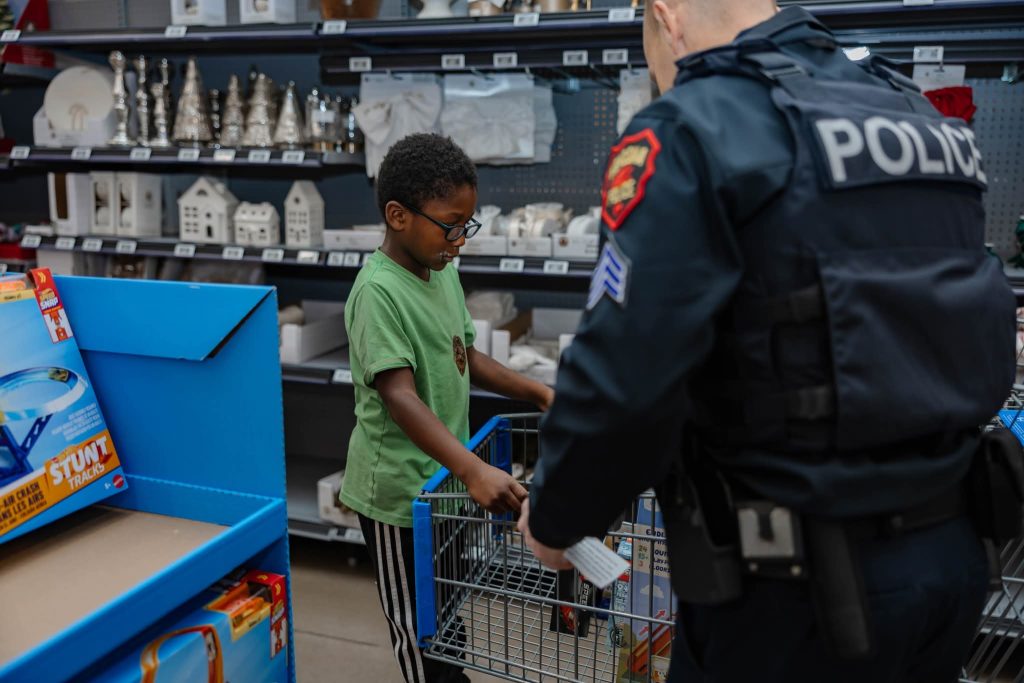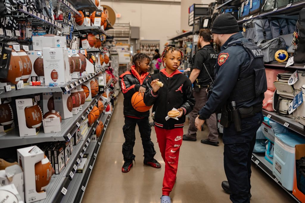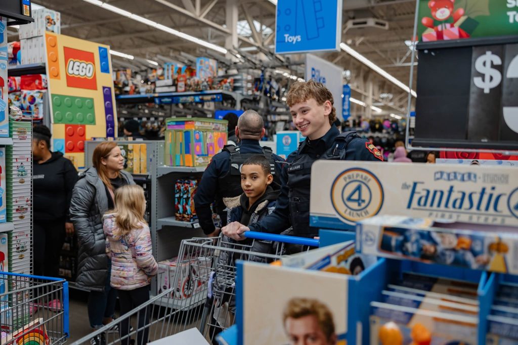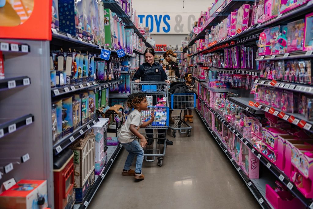 Officers walked shoulder-to-shoulder with the kids, pushing carts, helping pick out toys, clothes and electronics, and sharing laughs along the way. Many parents and guardians stood nearby watching proudly as the children shopped and shared stories with the officers.