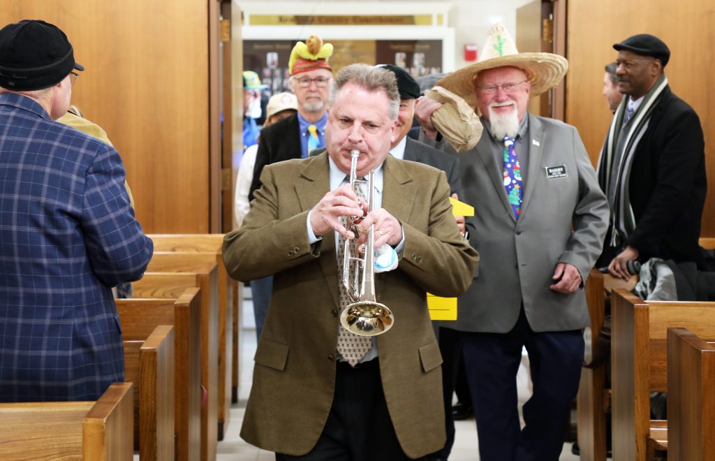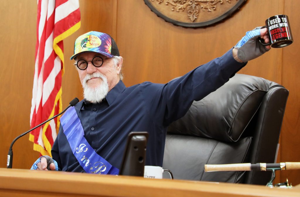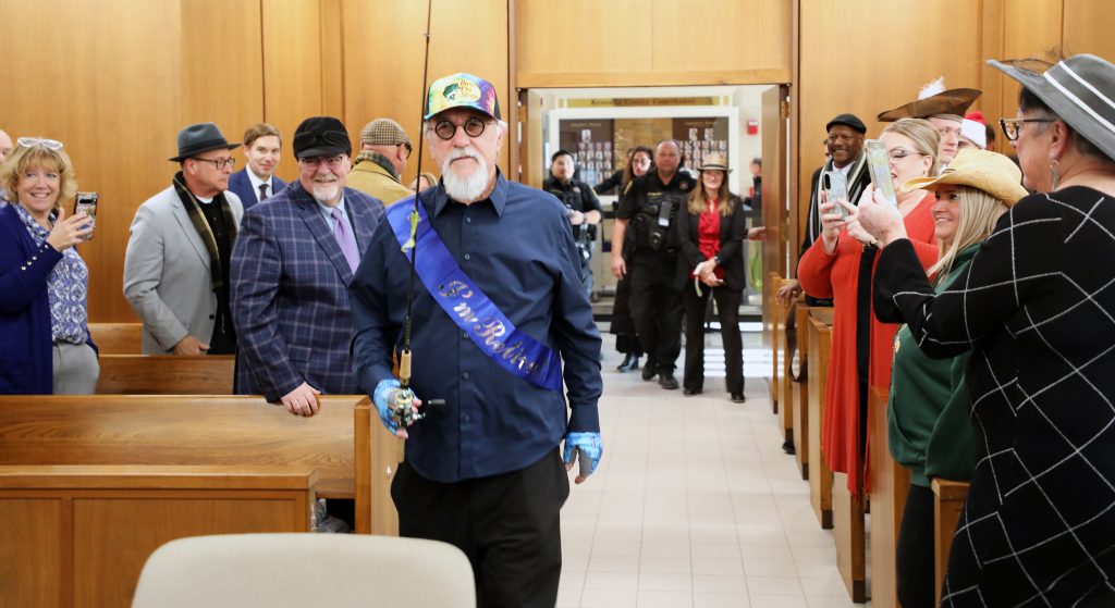 The normally strict courtroom decorum gave way to humor and warmth. The no-hats-in-court rule was suspended — hats were encouraged — and Milisauskas traded his robe and gavel for fishing gear and a sash that read “I’m retired.” Court staff led him in through the courtroom in a parade, complete with trumpet fanfare performed by Kenosha County Senior Assistant Corporation Counsel John Moyer.