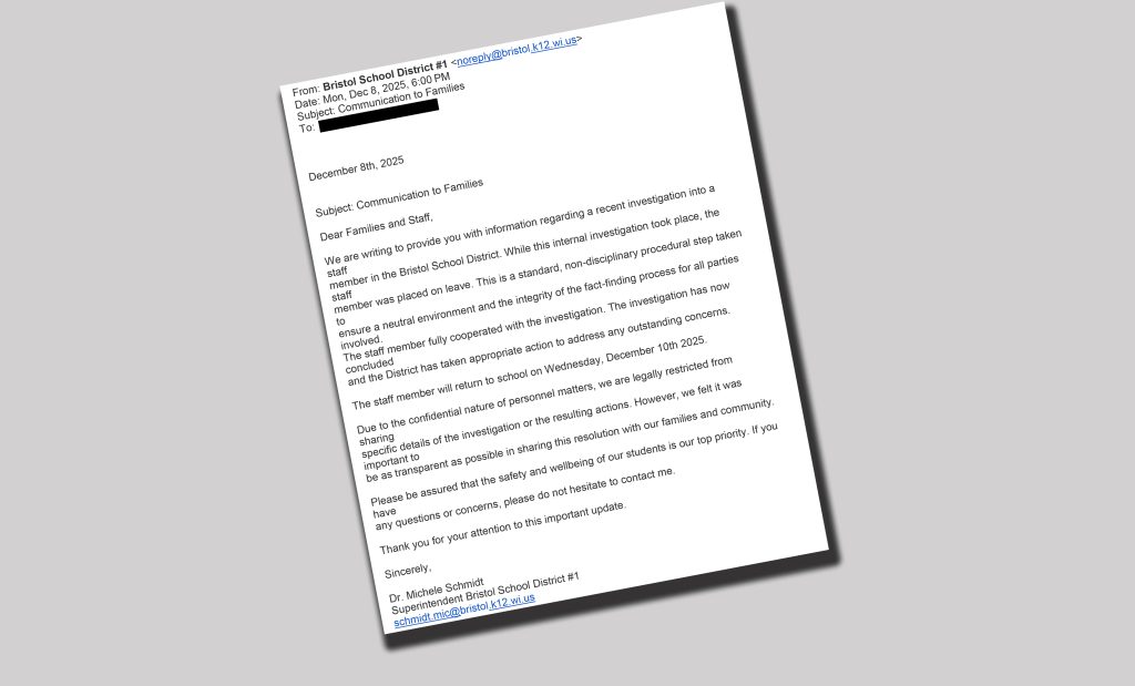 BRISTOL, Wis. — On December 8th, every Bristol School District parent received a district-wide email informing them that a staff member had been placed on leave while an internal investigation was conducted, that the investigation had concluded, that the district had taken “appropriate action,” and that the staff member would be returning to work.