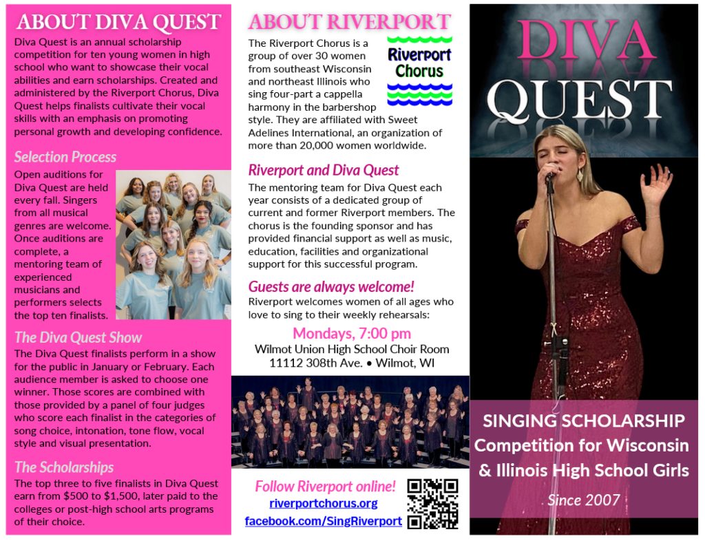 Diva Quest is presented by the Riverport Chorus, which marked its 60th anniversary in 2024 and is affiliated with Sweet Adelines International. Singing women interested in joining the chorus are welcome to attend rehearsals, which are held Monday evenings at Wilmot Union High School.