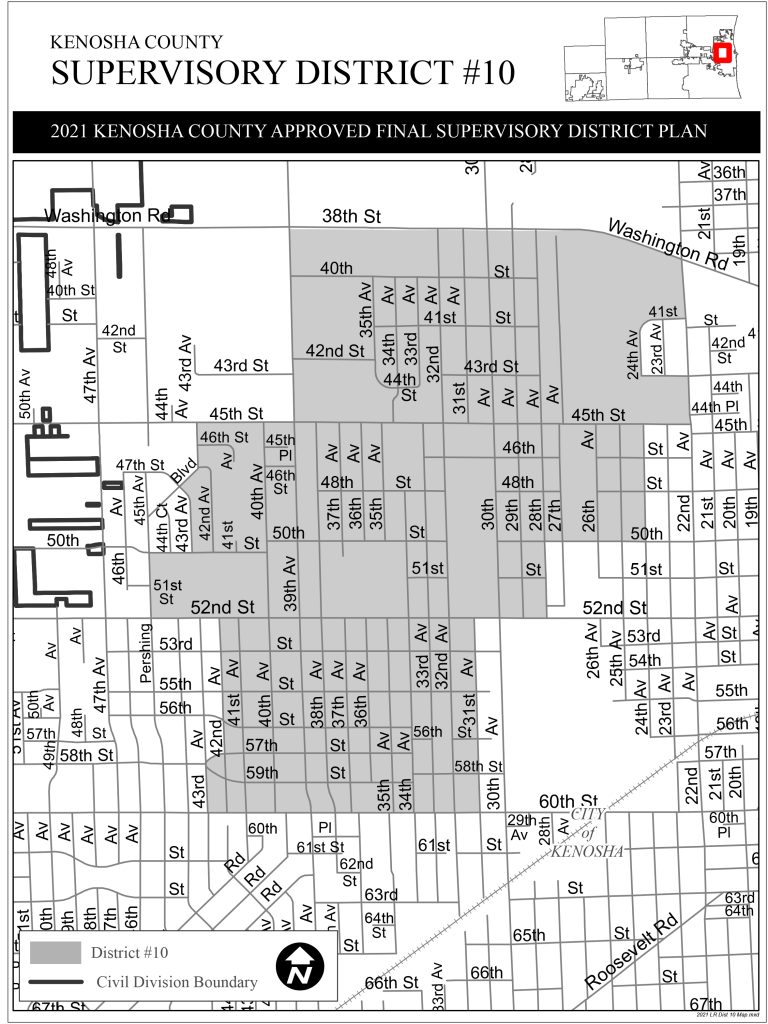 District 10 generally encompasses the central portion of the city of Kenosha. Its northern boundary is Washington Road, the eastern boundary runs roughly along 24th Avenue, and the western boundary is approximately 43rd Avenue. The southern edge of the district is around 60th Street, placing the seat squarely in the middle of the city.