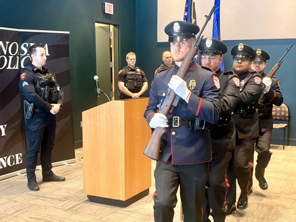 The ceremony opened with the presentation of colors by the department’s Honor Guard, followed by the Pledge of Allegiance led by Sgt. Cory Brennan of the department’s training division.