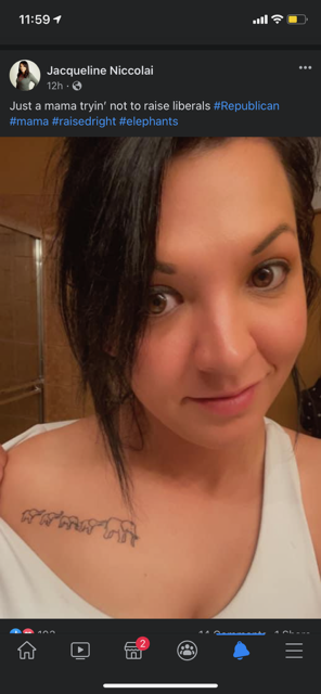 She’s also got a tattoo of a bunch of elephants on her shoulder from her previous life as a Republican lol. She is literally the most bat-shit person I have ever encountered in my life