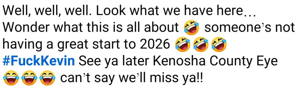 KENOSHAS, Wis. ─As Friday night began, a small but familiar group of online agitators took to Facebook to spin a routine, boring business filing into a fake crisis. What followed was not reporting, analysis, or even coherent commentary — just the usual pile-on from people who have either been exposed by Kenosha County Eye, embarrassed by it, or openly resent the fact that someone keeps receipts.