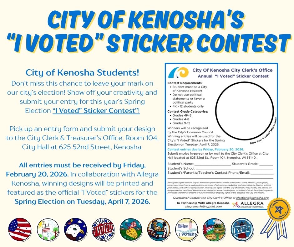 In partnership with Allegra Kenosha, the winning designs will be printed and distributed as the official “I Voted” stickers for the City of Kenosha’s Spring Election, scheduled for Tuesday, April 7, 2026.