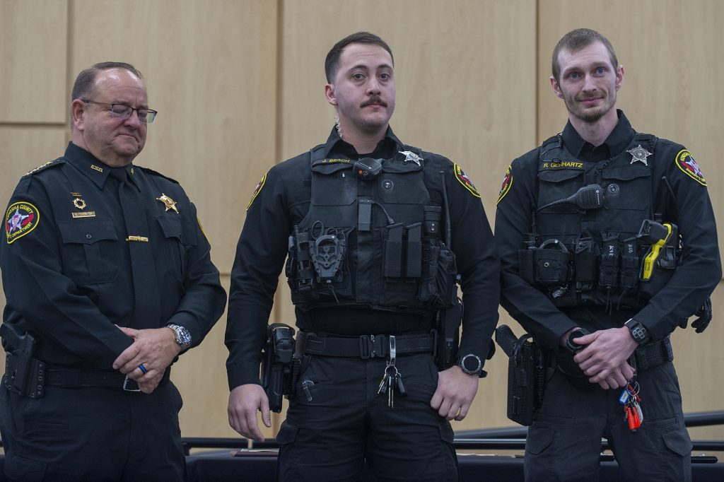 The Life-Saving Award was presented to Deputy Joseph Beach and Deputy Ryan Gerhartz for their actions during a medical emergency on May 2, 2025. The deputies responded to a call involving an unconscious and non-breathing woman, immediately began CPR upon arrival, and continued care until Salem Fire and Rescue personnel took over. The woman survived as a result of their prompt response.