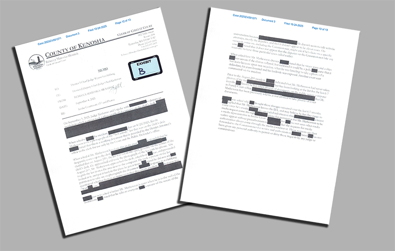 Paulson was assigned to the case after all Kenosha County circuit court judges recused themselves. He ruled February 19 that Kenosha County properly redacted a September 4, 2025 memorandum authored by Kenosha County Clerk of Courts Rebecca Matoska-Mentink.