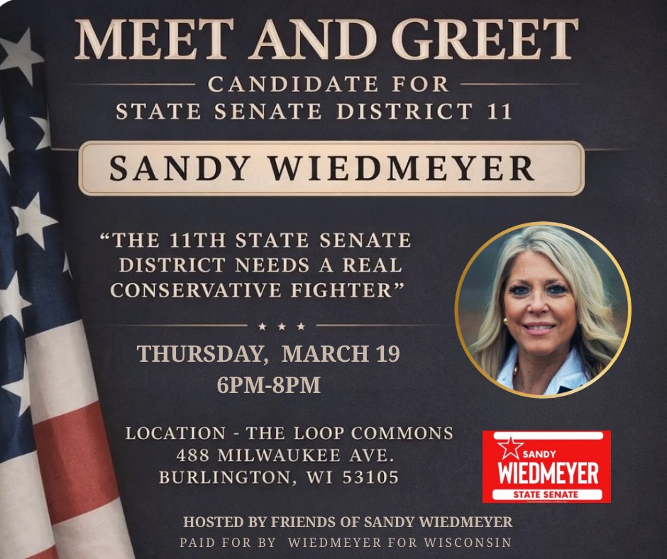 “I chose to hold my first meet and greet in Burlington because this campaign is about representing the entire 11th Senate District,” Wiedmeyer said. “While I’m proud to call Kenosha County home, I wanted to begin outside my home county to show my commitment to listening to communities across the district. In the coming weeks and months, I look forward to hosting meet and greets throughout the entire district, from east to west and north to south, so I can meet with as many residents as possible and hear directly about the issues that matter most to them.”