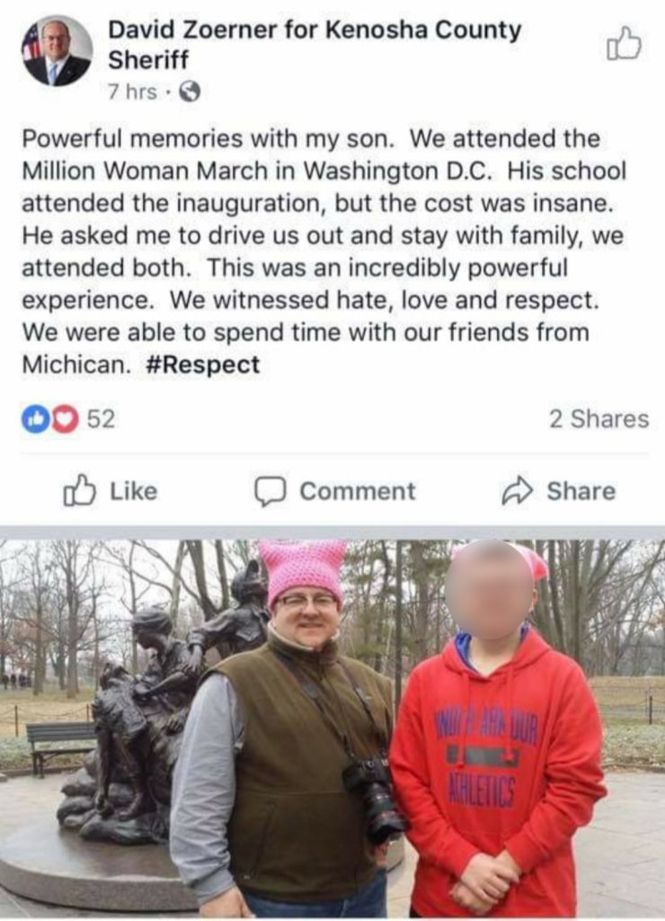 Zoerner’s past has become a recurring issue in local politics. Before running for sheriff as a Republican, Zoerner ran as a Democrat and was photographed attending liberal marches while wearing a pink “pussyhat,” a symbol associated with the 2017 Women’s March movement and progressive politics. He has also been photographed with Democratic Gov. Tony Evers, who remains unpopular with many conservatives in Kenosha County. Critics have long argued that Zoerner’s switch to the Republican Party was more about electability than ideology.