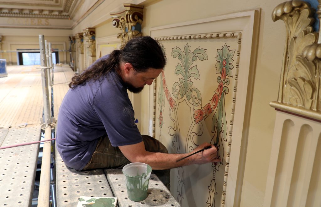 Workers from Michigan-based Historic Surfaces LLC are restoring decorative finishes and architectural details that had been covered up for more than 50 years. The project is expected to be completed by the end of June.